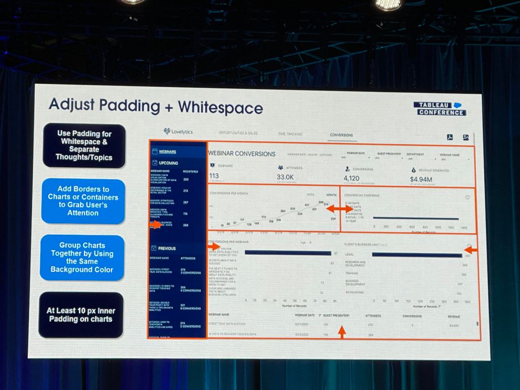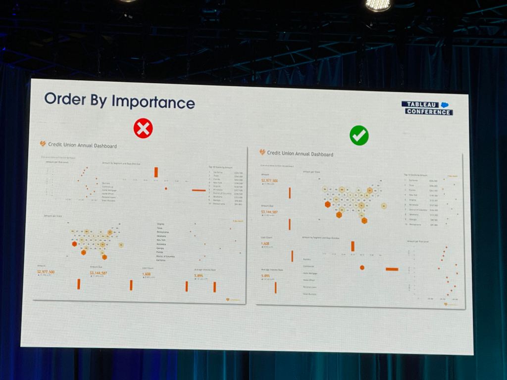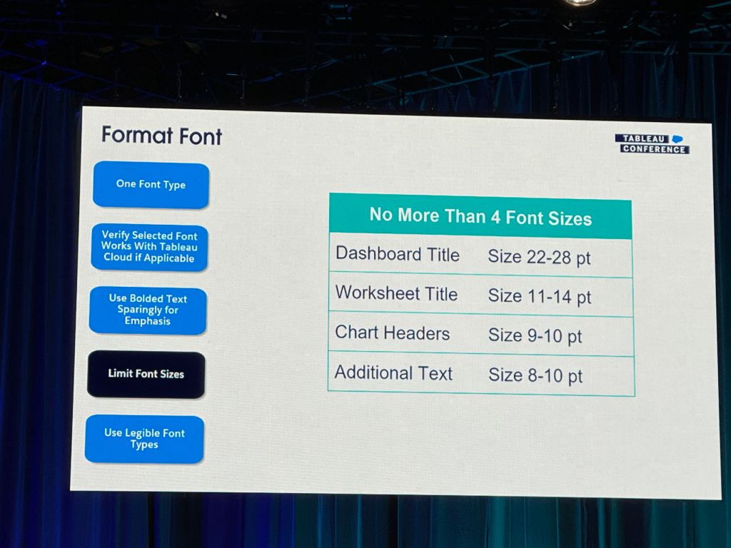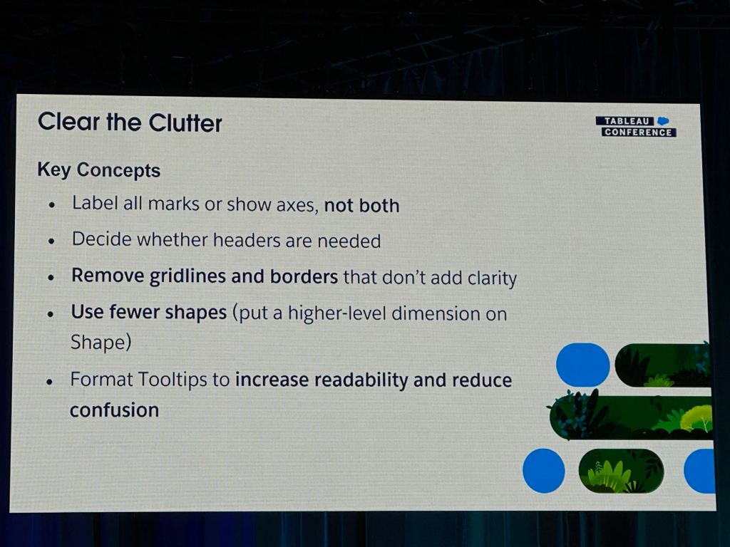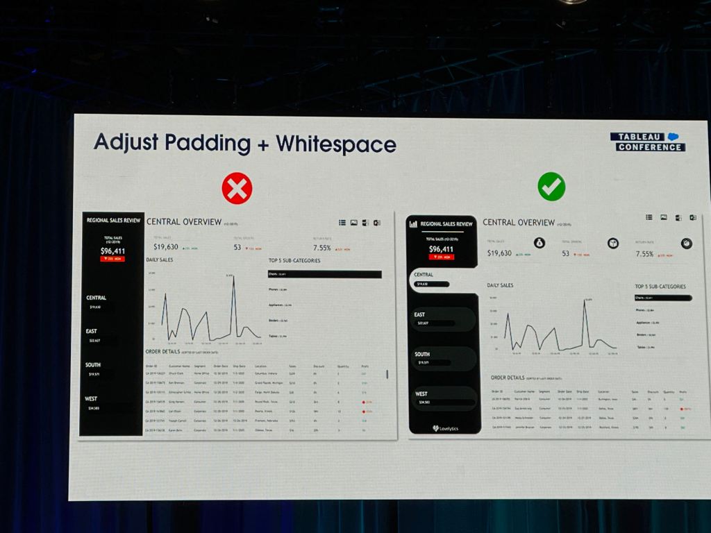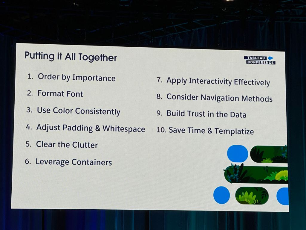 I also took some notes from the session that Eric and Cait showed how they improve a Tableau dashboard for their client using the checklist above.