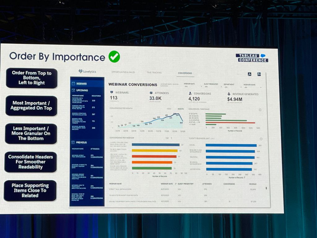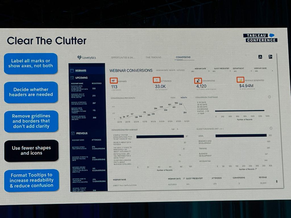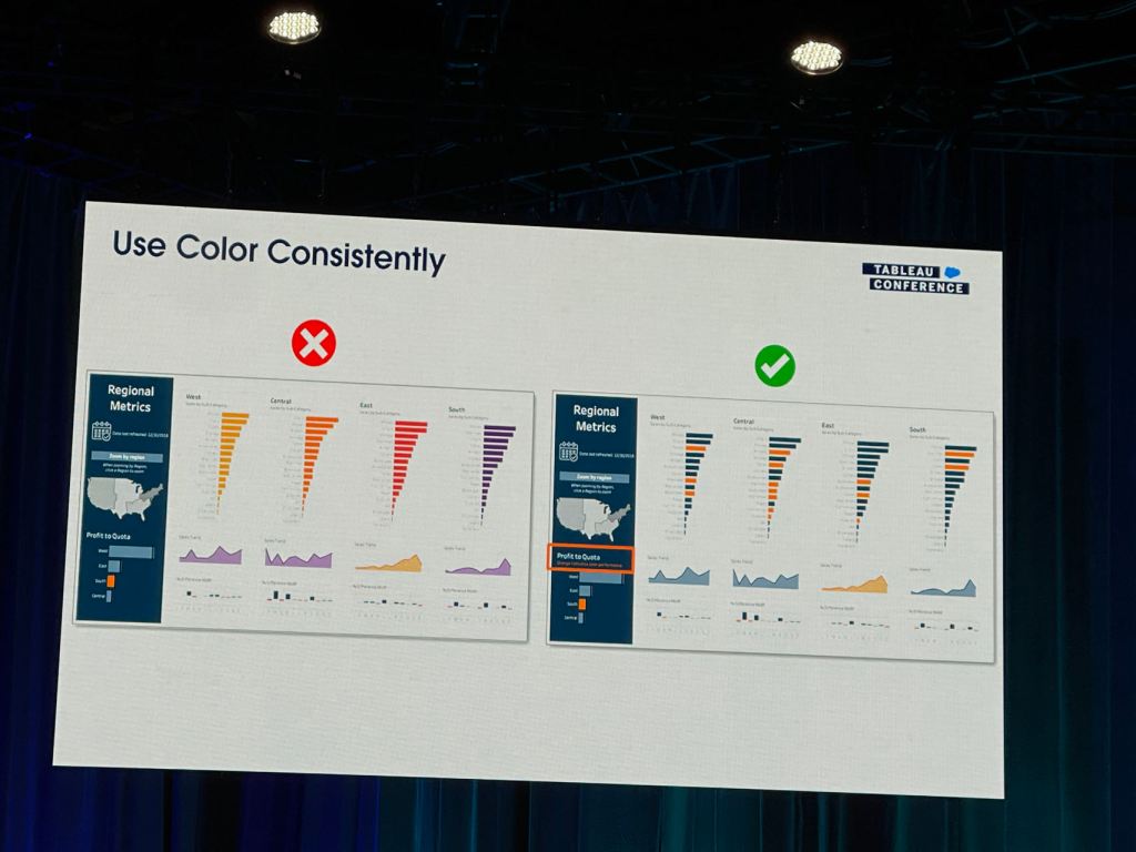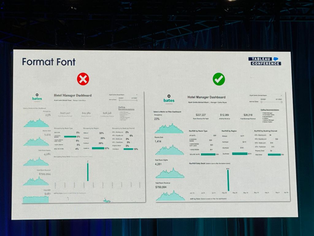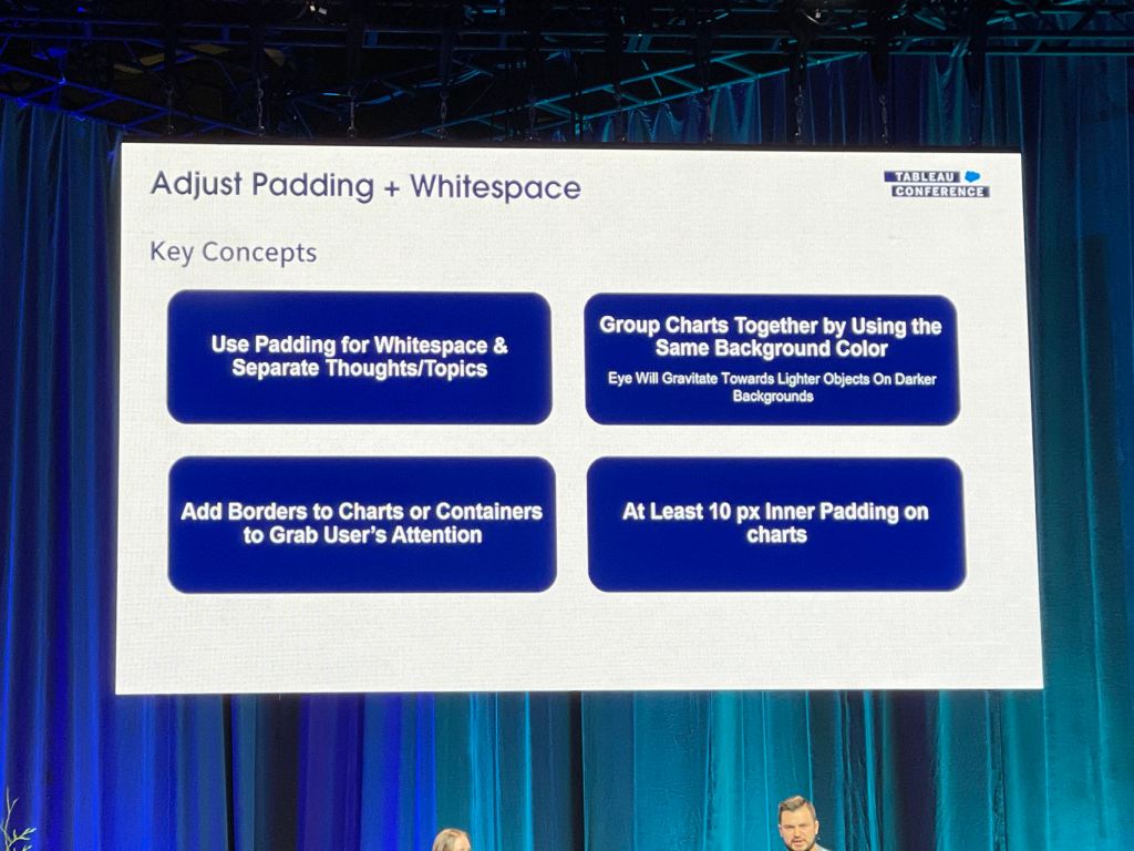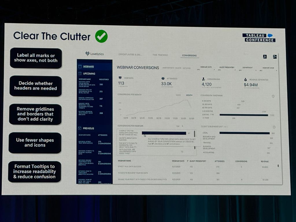 I also took some notes from the session that Eric and Cait showed how they improve a Tableau dashboard for their client using the checklist above.