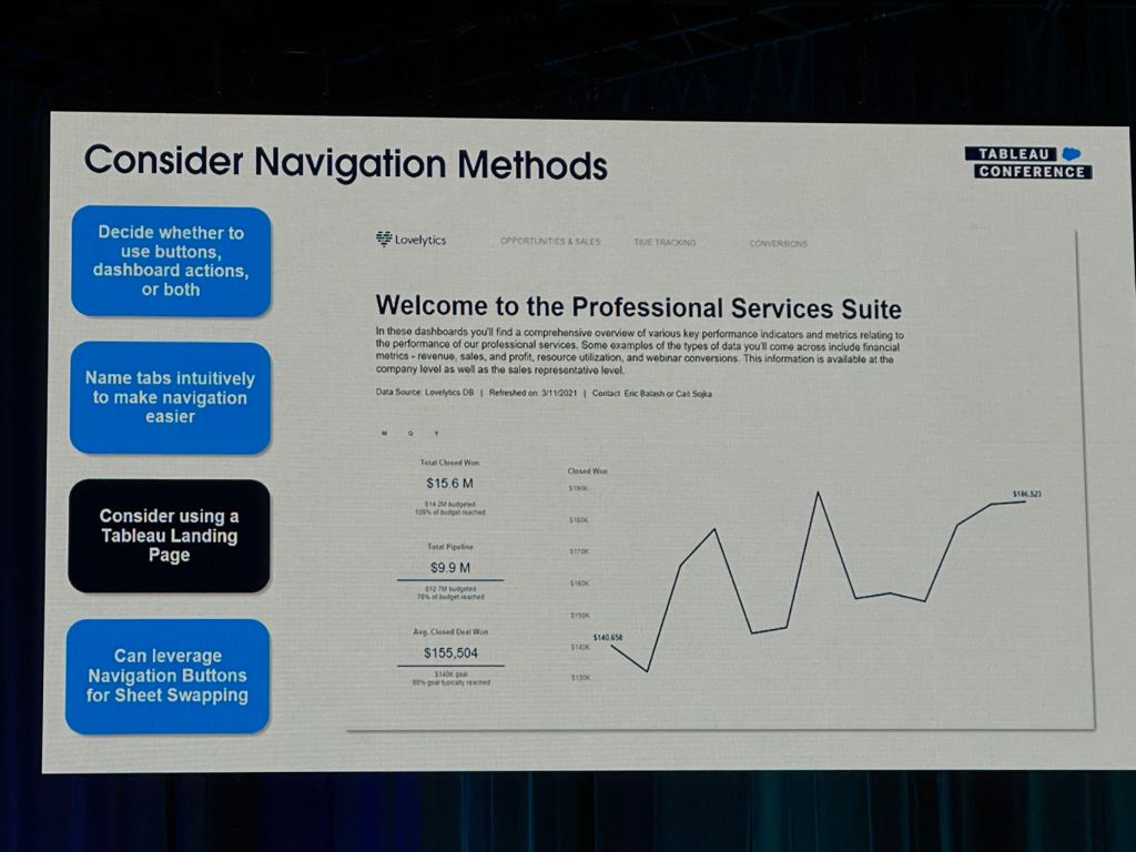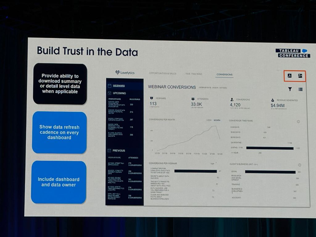 Blair Hutchinson and Sterling Winter presented how Tableau Catalog’s capabilities can be used to build trust in data and improve governance. They showcased best practices for surfacing valuable metadata in the flow of analysis.