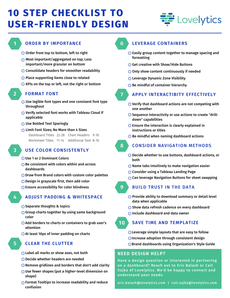 We can download the checklist from Lovelytics website: 10 Steps to User-Friendly Design.